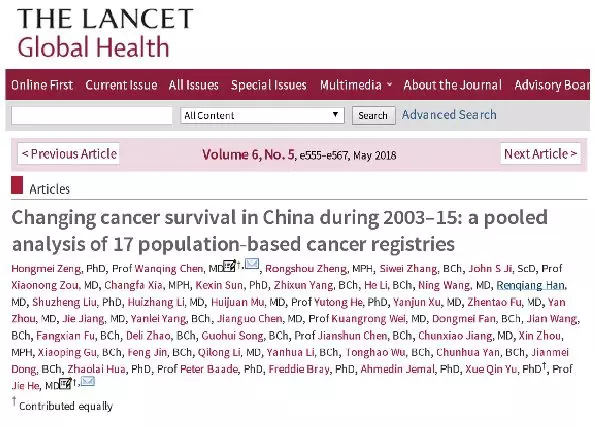 由國(guó)家癌癥中心(NCC)赫捷院士、陳萬(wàn)青教授領(lǐng)銜發(fā)表于《柳葉刀·全球衛(wèi)生》雜志的一項(xiàng)統(tǒng)計(jì)學(xué)研究表明,我國(guó)17個(gè)癌癥登記處覆蓋人群的癌癥生存率在2003-2015年間呈總體顯著增加的趨勢(shì),從2003-2005年到2012-2015年,年齡標(biāo)準(zhǔn)化5年相對(duì)生存率在大多數(shù)癌種均有所增加,其中隨時(shí)間推移生存率穩(wěn)定增長(zhǎng)且增幅最大的是子宮體癌(每個(gè)時(shí)間段平均變化率5.5%)、甲狀腺癌(5.4%)、宮頸癌(4.5%)、骨腫瘤(3.2%)。僅胰腺癌和膽囊癌未觀察到生存率改善。