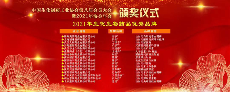 2021年12月18日,在北京召開(kāi)的“中國(guó)生化制藥工業(yè)協(xié)會(huì)第八屆會(huì)員大會(huì)暨2021年協(xié)會(huì)年會(huì)”上,海南中和藥業(yè)產(chǎn)品和雙?醋酸阿托西班注射液榮獲“2021年生化生物藥品優(yōu)秀品牌”稱號(hào)。