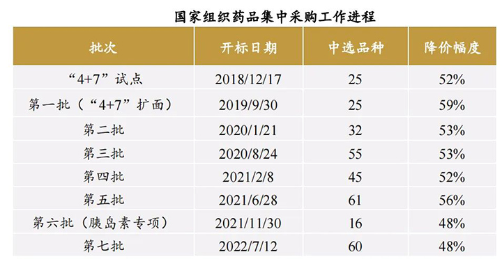 從2018年國家醫(yī)保局成立為起點,截至 2022 年第二季度末,我國國家組織藥品集中采購已開展近5年。5年間,涉及7 批國家組織藥品集中采購,覆蓋 294 種藥品,按集采前價格測算,涉及金額約占公立醫(yī)療機構化學藥、生物藥年采購額的 35%,一大批常見藥、慢病藥、抗癌藥價格大幅降低,平均降幅 53%。