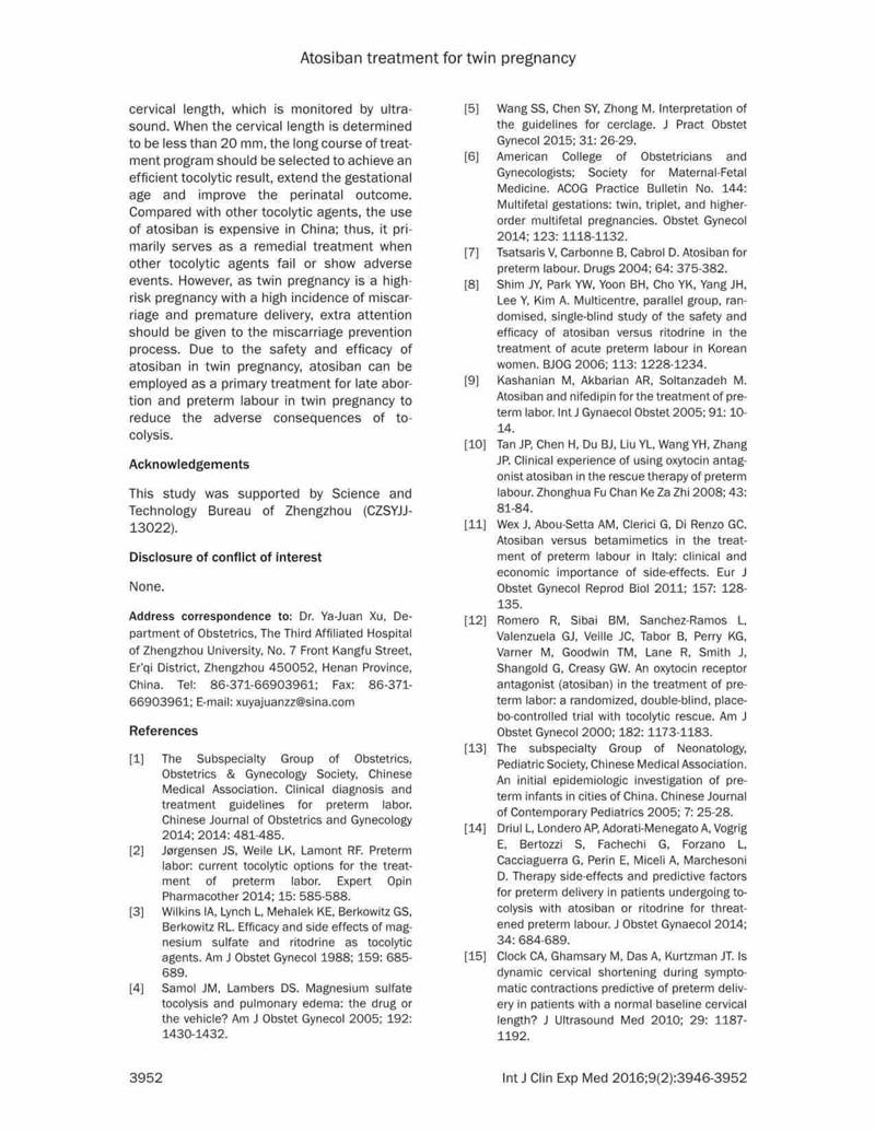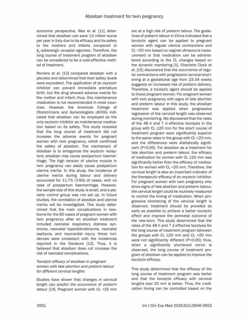 結(jié)論:阿托西班可有效延長晚期流產(chǎn)以及早產(chǎn)的雙胎妊娠的妊娠時(shí)間。對于宮頸長度<20mm的病例,長療程治療更有效,效果更好。長期治療不會(huì)增加母嬰的不良反應(yīng)。