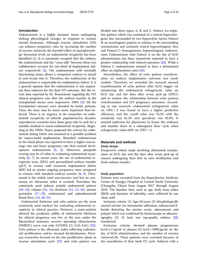 方法:在2017年8月至2018年8月,前瞻性隊(duì)列研究共招募了146名首次接受體外受精周期的不孕女性。監(jiān)測(cè)這些患者在hCG日和取卵后1-3天(OPU + 1, OPU + 2, OPU + 3)的子宮內(nèi)膜回聲模式。