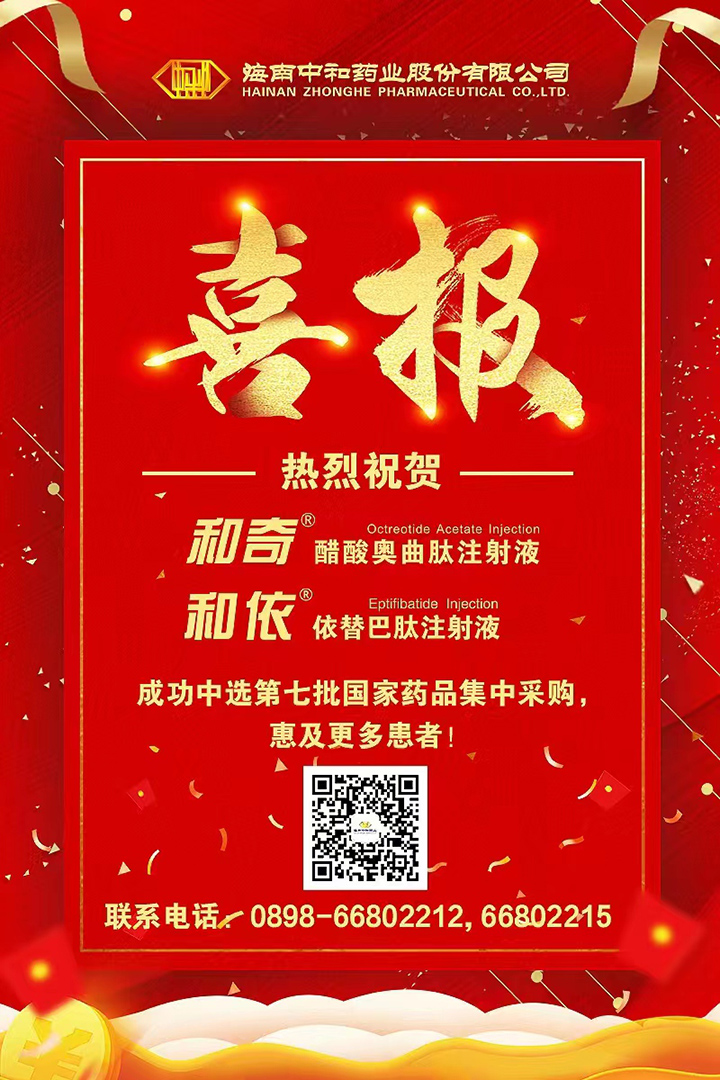 2022年7月12日,在國家醫(yī)保局等相關(guān)部門組織和指導(dǎo)下,全國各省份組成采購聯(lián)盟開展第七批國家組織藥品集中采購在江蘇省南京市開標(biāo)。海南中和藥業(yè)股份有限公司攜兩產(chǎn)品參加了本次國采并成功雙雙中選,和依®依替巴肽注射液6進(jìn)4第一順位中標(biāo),和奇®奧曲肽注射液10進(jìn)8,第七位順利中標(biāo)。