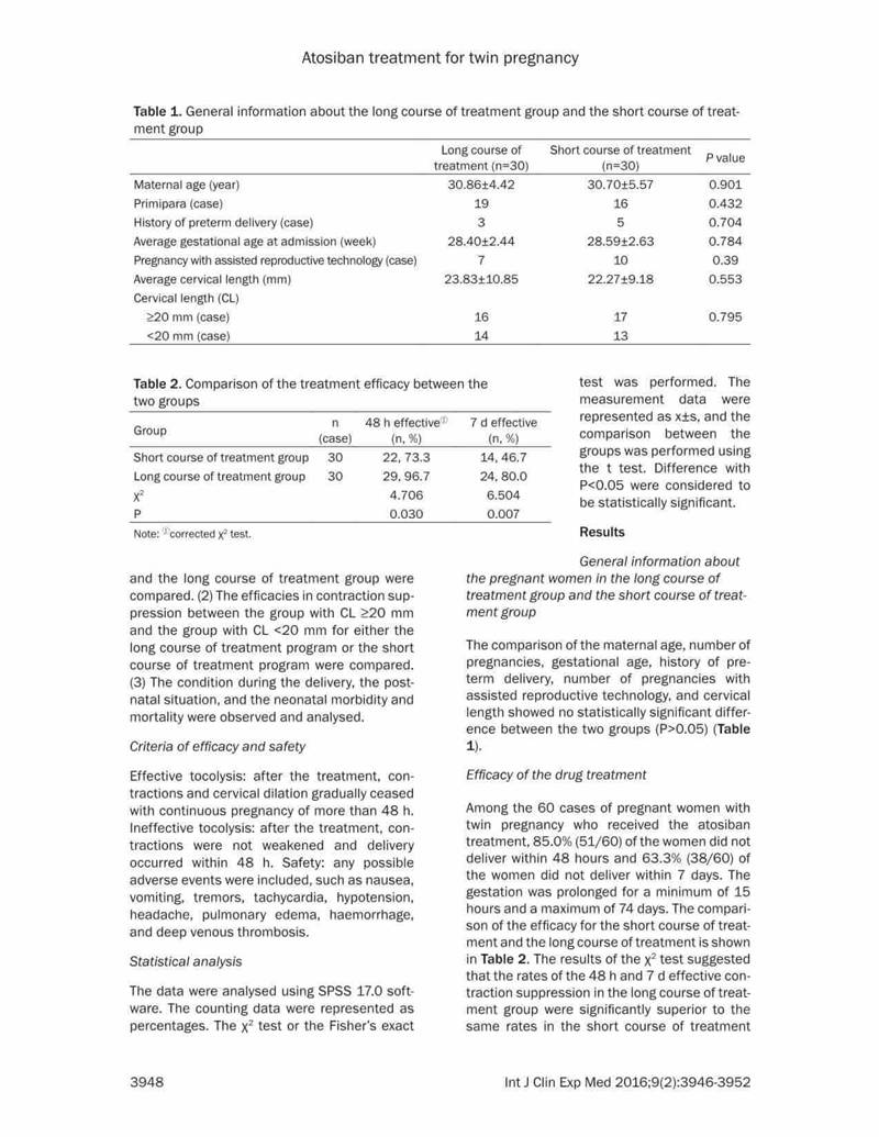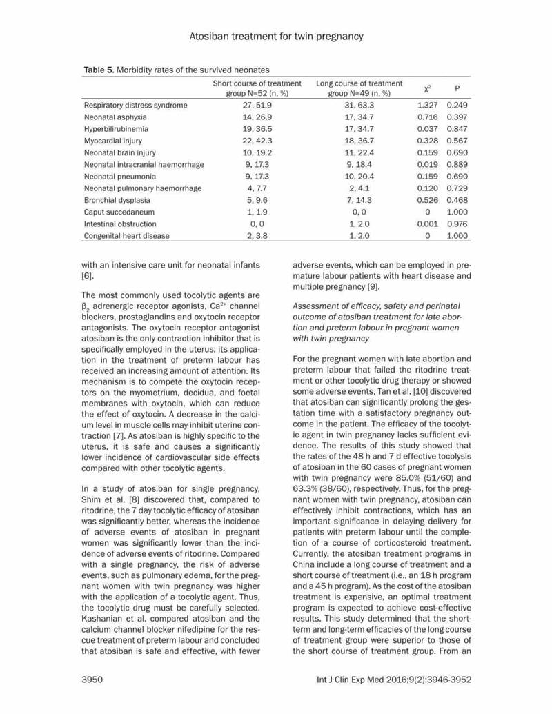 結(jié)論:阿托西班可有效延長晚期流產(chǎn)以及早產(chǎn)的雙胎妊娠的妊娠時(shí)間。對于宮頸長度<20mm的病例,長療程治療更有效,效果更好。長期治療不會(huì)增加母嬰的不良反應(yīng)。