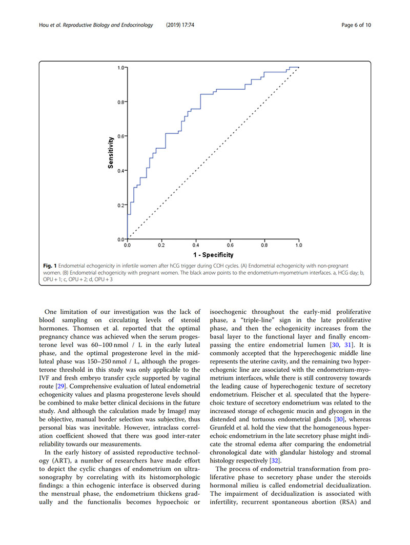 方法:在2017年8月至2018年8月,前瞻性隊(duì)列研究共招募了146名首次接受體外受精周期的不孕女性。監(jiān)測(cè)這些患者在hCG日和取卵后1-3天(OPU + 1, OPU + 2, OPU + 3)的子宮內(nèi)膜回聲模式。